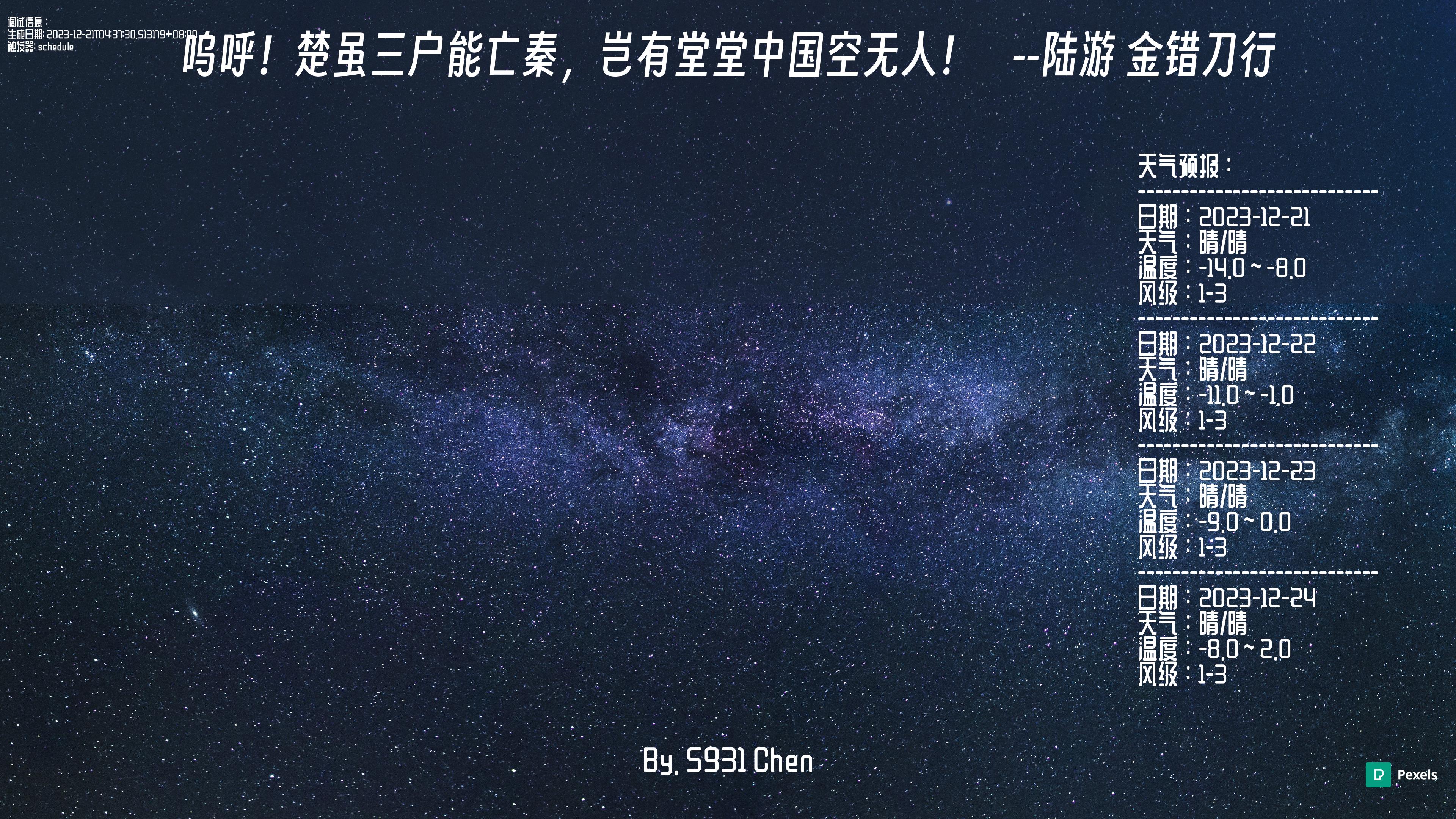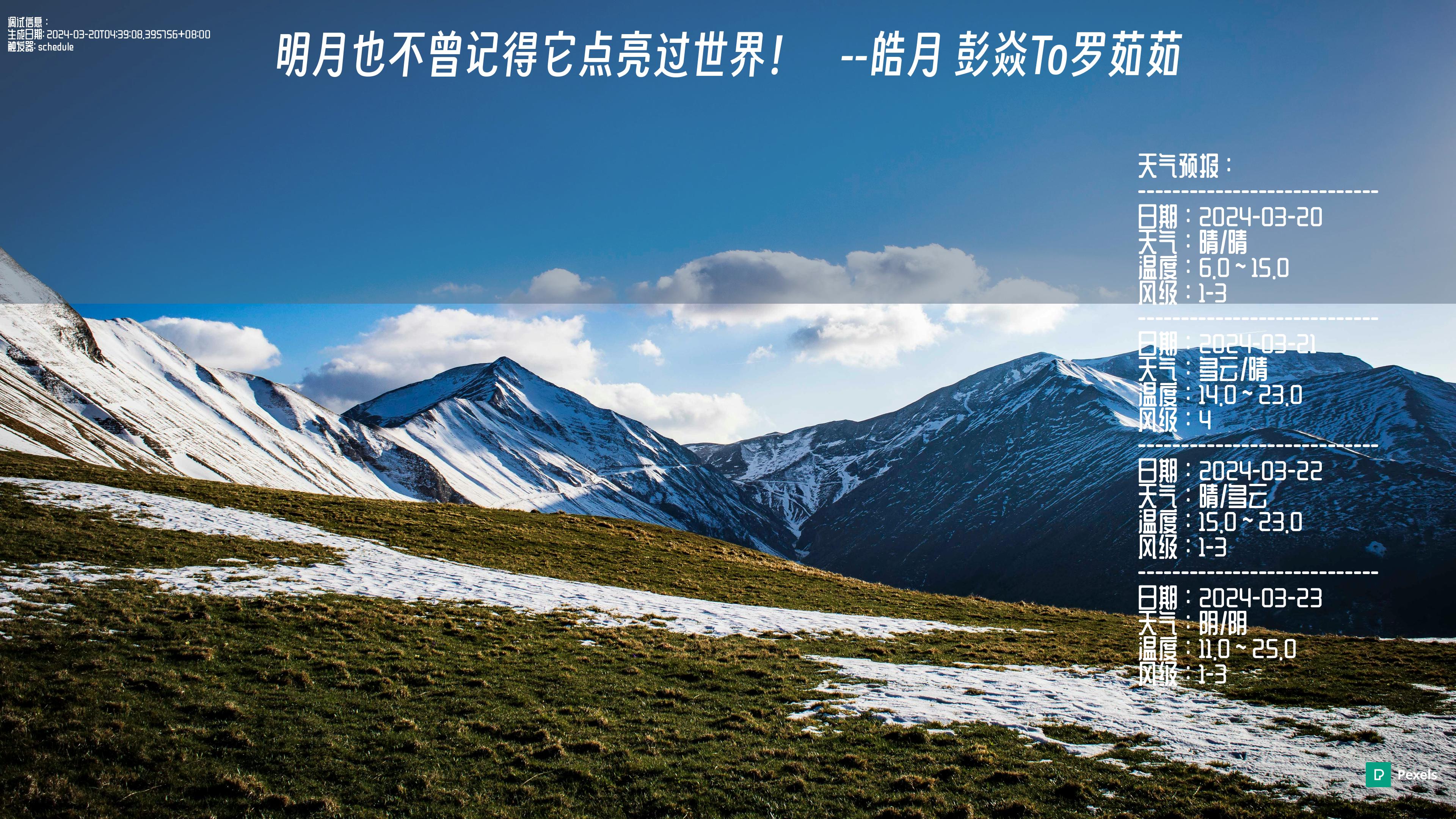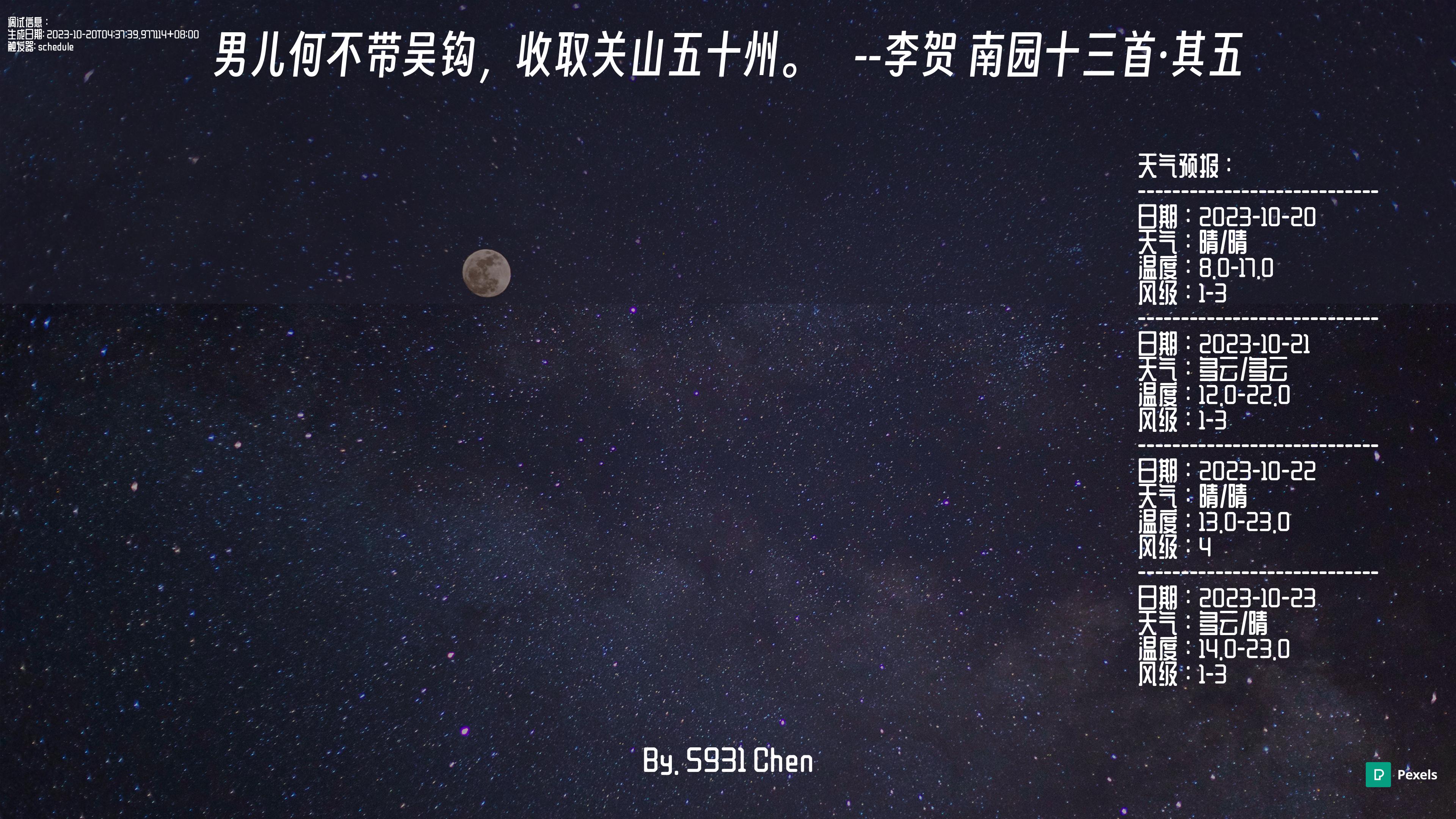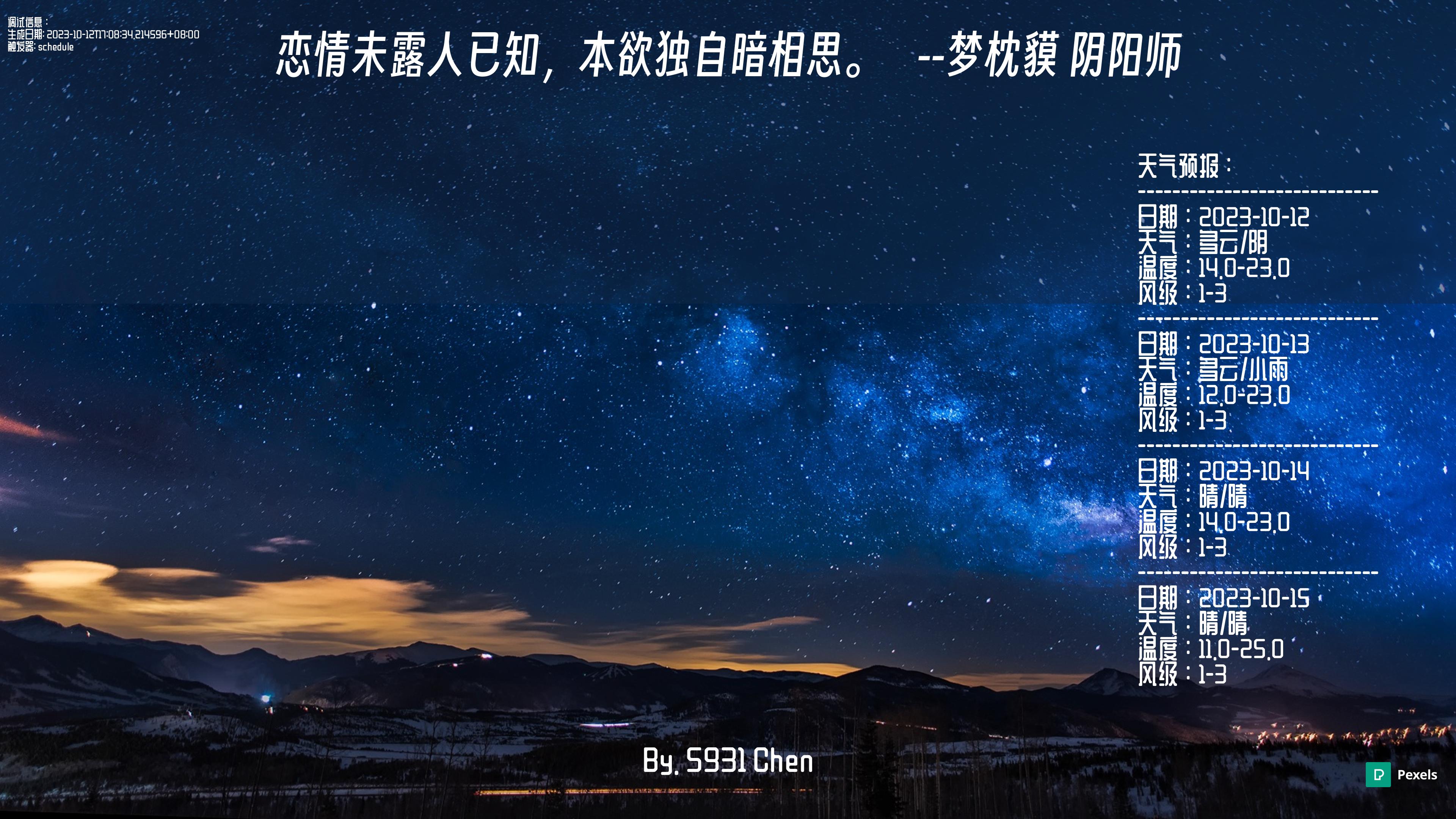 | 2023-06-27 | 1314186 | 云母屏风烛影深,长河渐落晓星沉。 | 图片链接 | schedule |